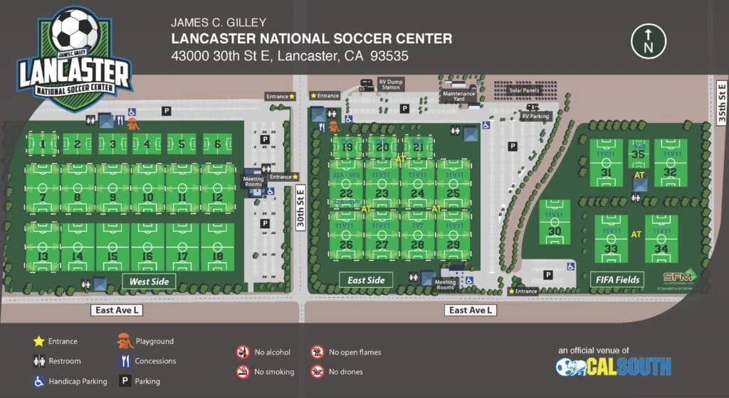 The Lancaster National Soccer Center is the largest soccer complex in the West. The facility includes 35 premium fields, with 11 fields fully lighted. A highlight of the Soccer Center is the five FIFA fields, so designated due to meeting the International FIFA specifications for turf quality. With an ongoing relationship with Cal South Youth Soccer Organization, the Lancaster National Soccer Center has been designated as an Official Cal South Venue.